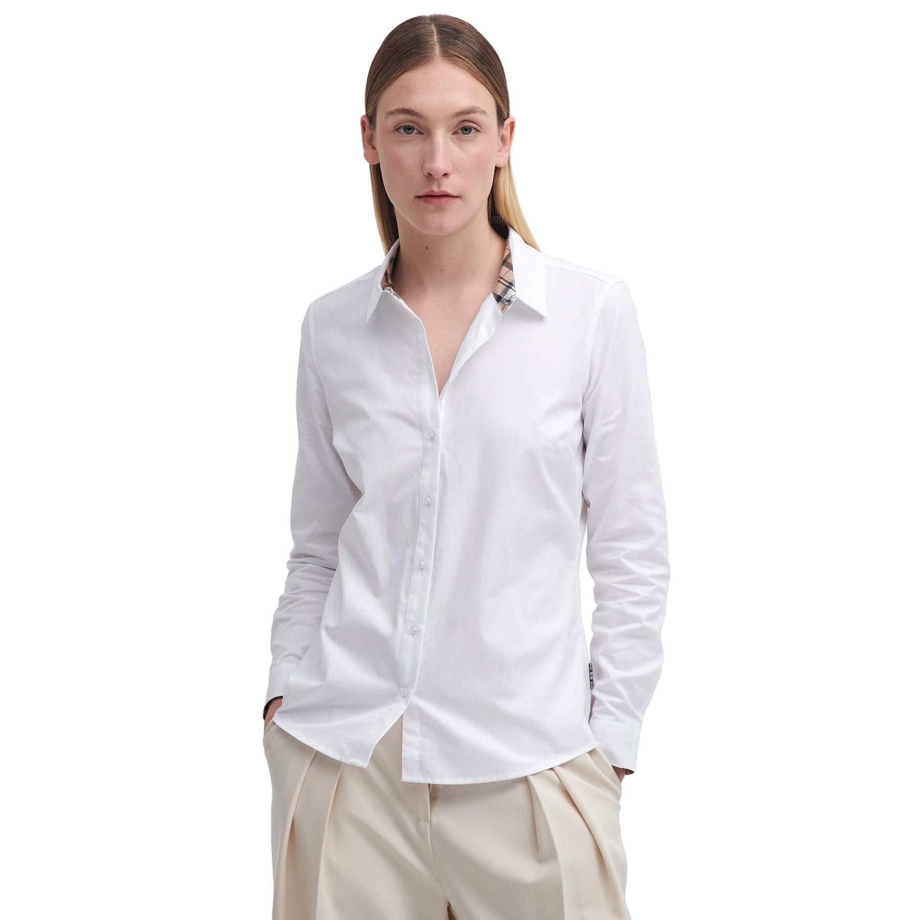 Inserto tartan all'interno di colletto e polsini;