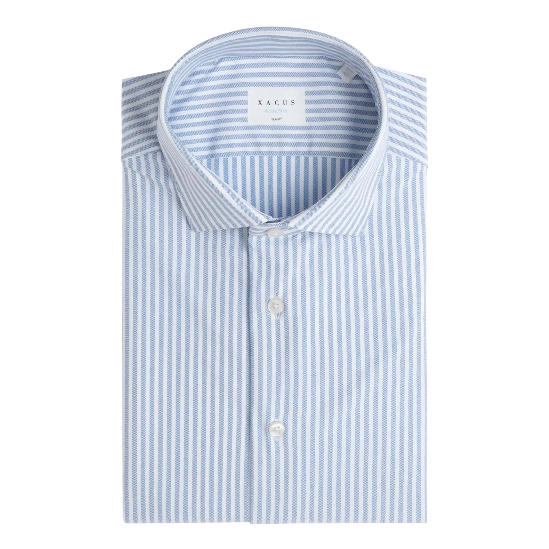 Camicia Uomo slim firmata Xacus realizzata in puro cotone di qualità. Presenta un colletto alla francese piccolo ed un elegante motivo a righe verticali. Una camicia senza tempo!