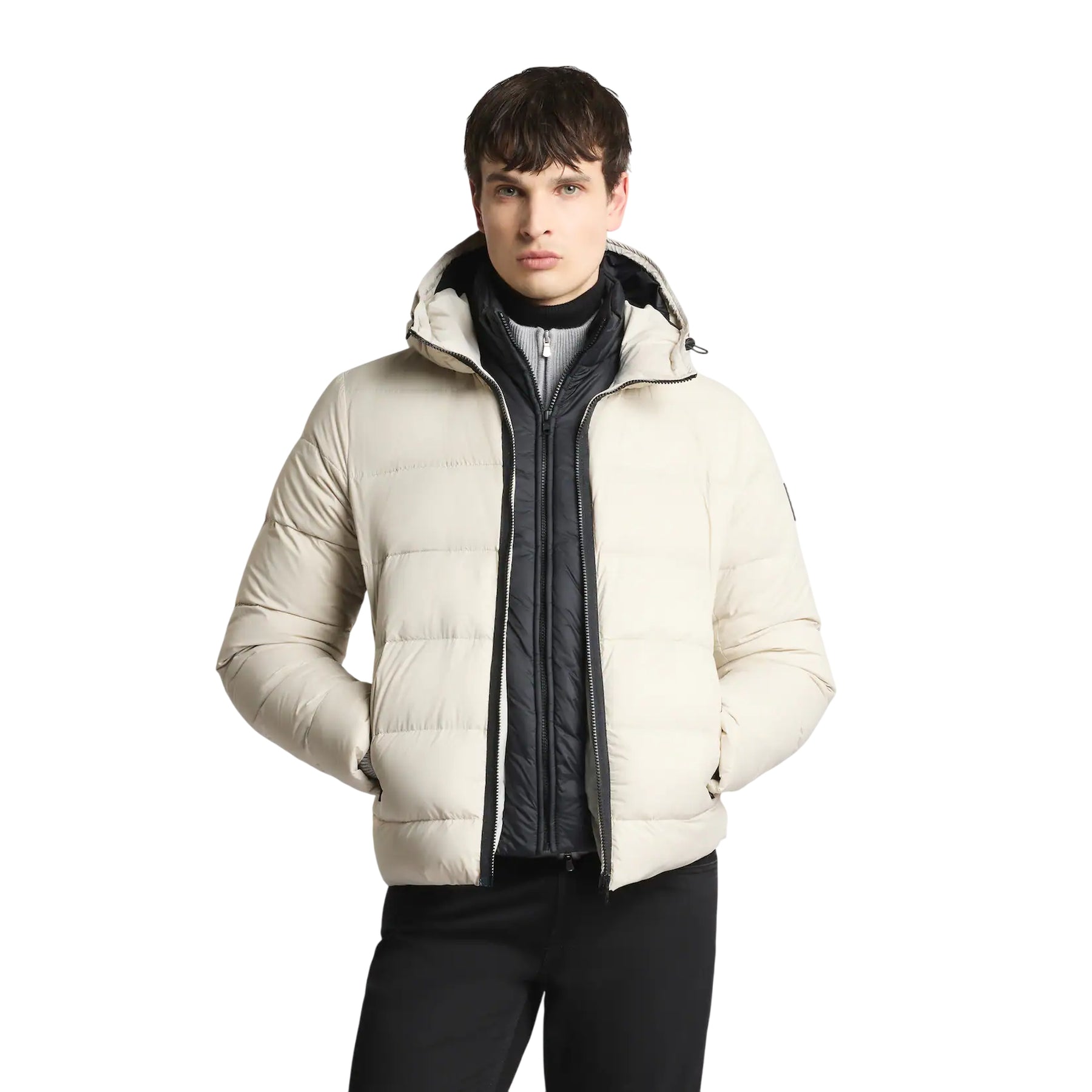 Piumino Uomo corto firmato Fay realizzato in nylon calandrato, con impunture orizzontali. Presenta due tasche laterali con zip ed un pratico cappuccio. Un piumino dal design minimal, che non passa mai di moda!