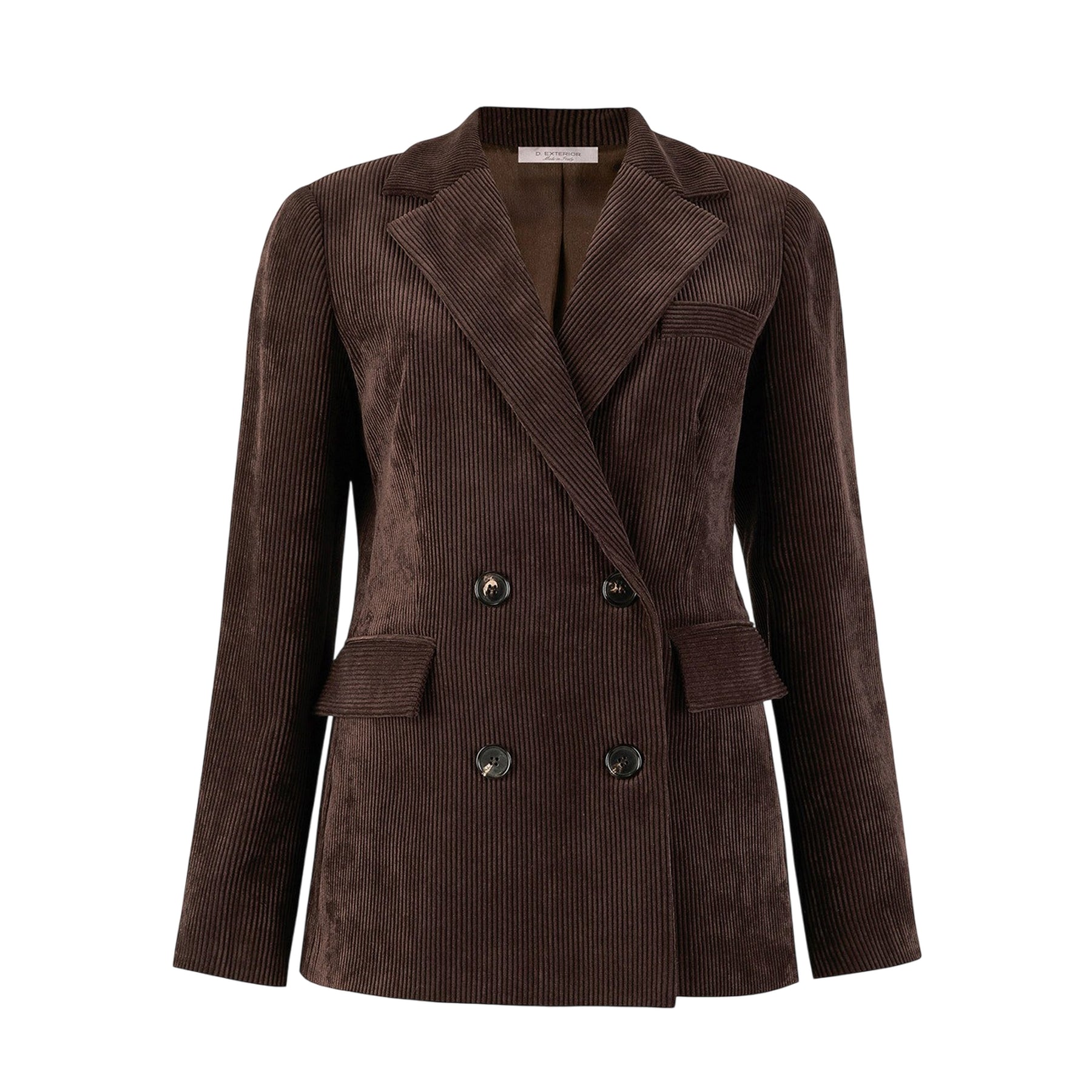Giacca Donna firmata D.Exterior realizzata in velluto tinta unita, lavorato a costine sottili, con una chiusura doppiopetto e patte laterali. Una giacca blazer raffinata e versatile, che non passa mai di moda!