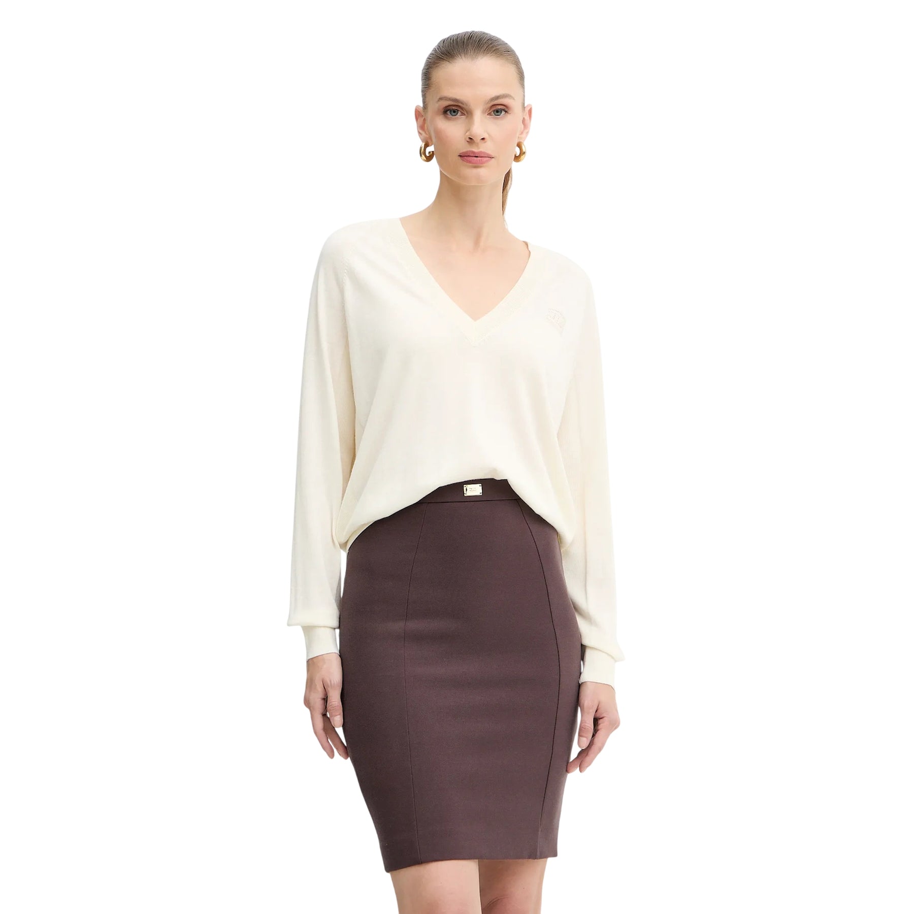 Questo elegante Maglione donna in tinta unita bianca firmato Elisabetta Franchi è il capo essenziale che completa qualsiasi guardaroba. Lo scollo profondo a V valorizza il décolleté con una silhouette sofisticata, mentre le maniche lunghe garantiscono calore e comfort durante i mesi più freddi. I dettagli a costine su scollo, orlo e polsini assicurano una vestibilità impeccabile e una maggiore durata nel tempo. Perfetto da indossare da solo o in abbinamento con altri pezzi, questo maglione versatile si adatta a molteplici occasioni, dal casual al più raffinato.