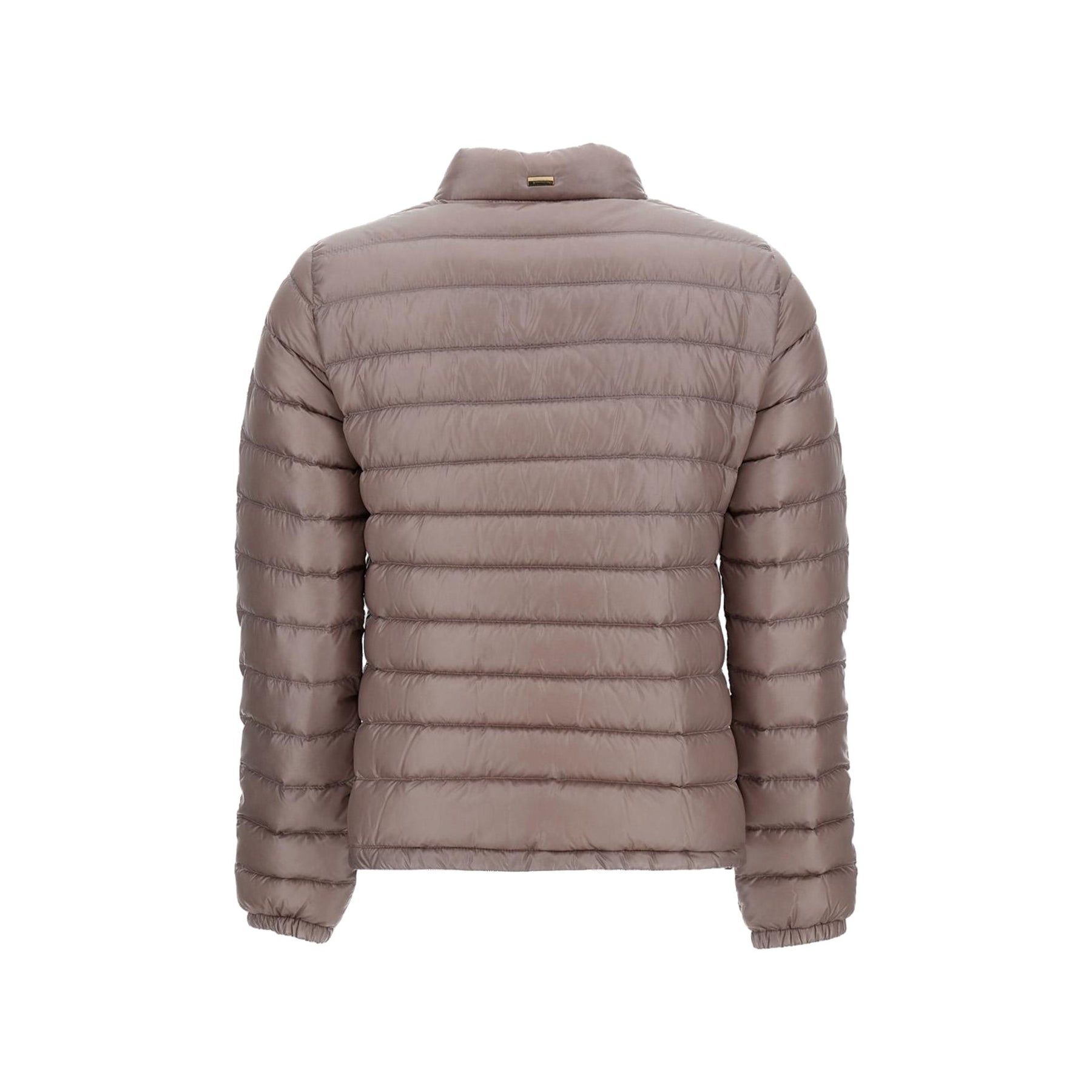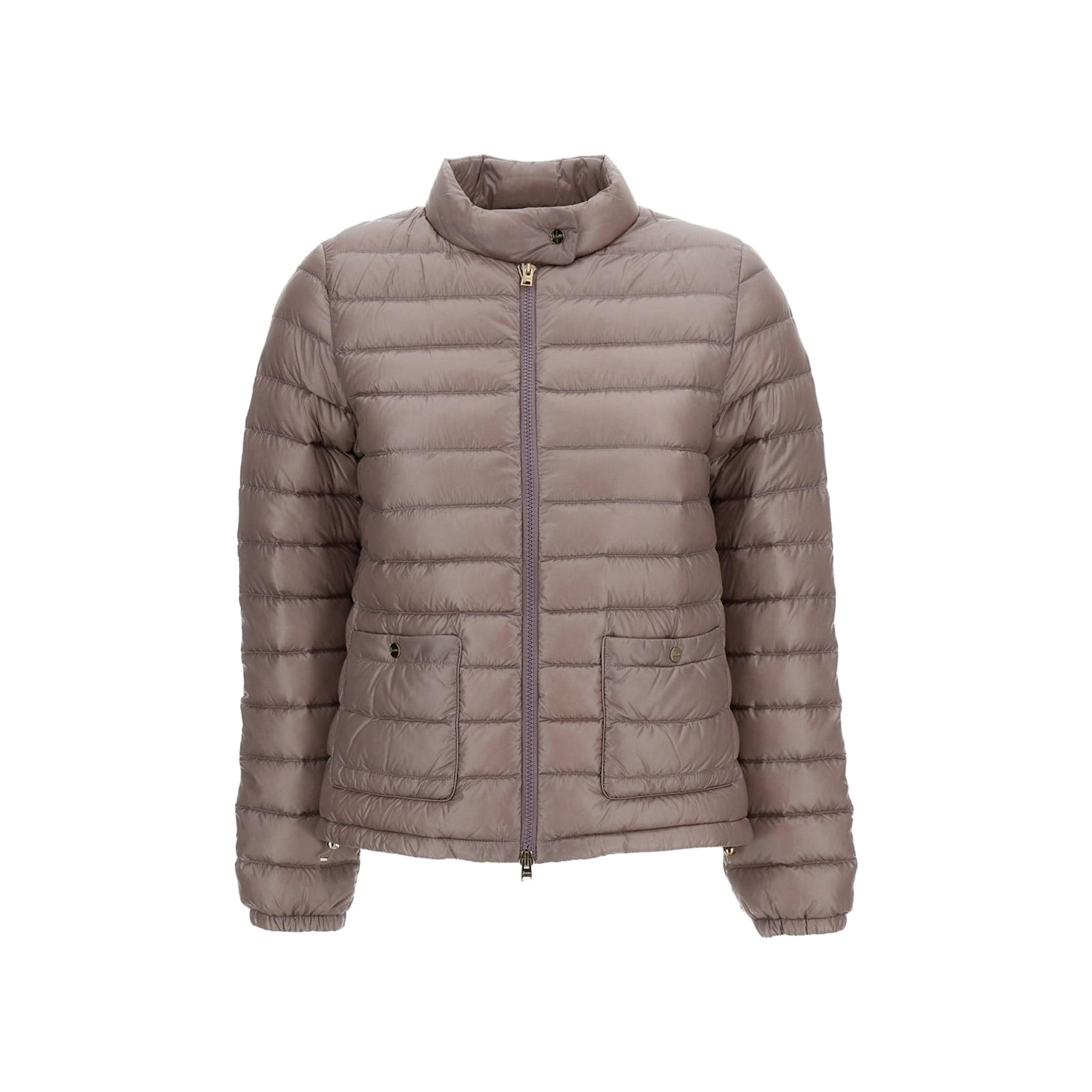 Giubbino corto da donna con trapuntature orizzontali firmato Herno. Il modello presenta un colletto alto con bottone e una chiusura frontale con zip che garantisce praticità e protezione. Le tasche applicate lateralmente aggiungono funzionalità, mentre i polsini elasticizzati assicurano una vestibilità confortevole e definita.