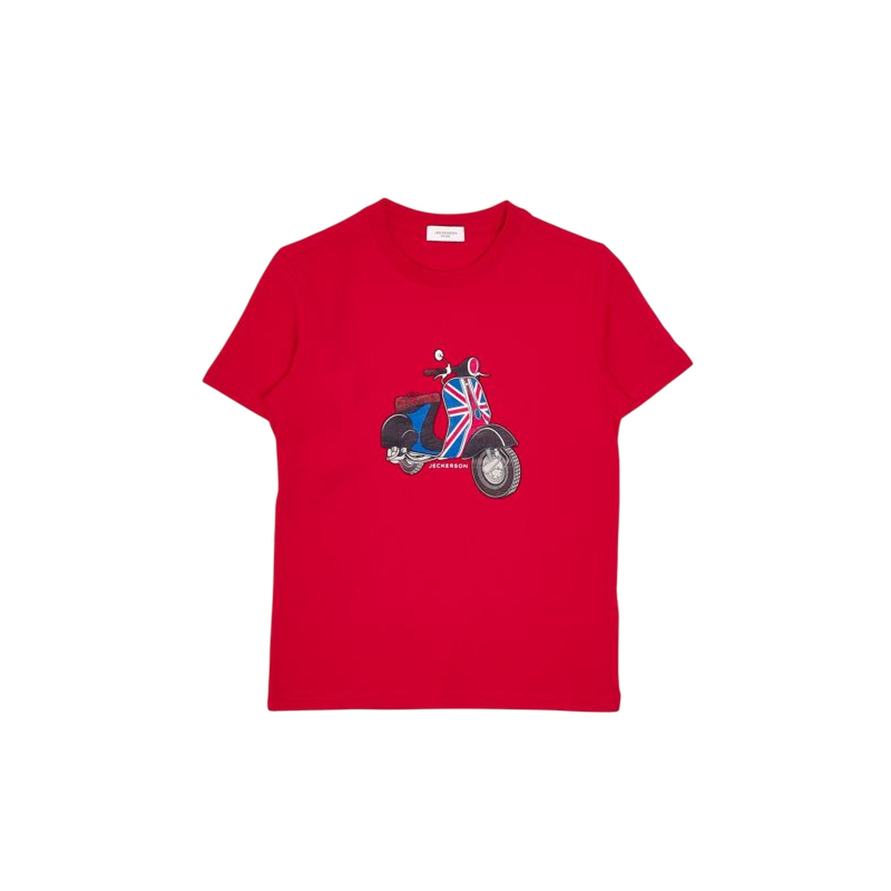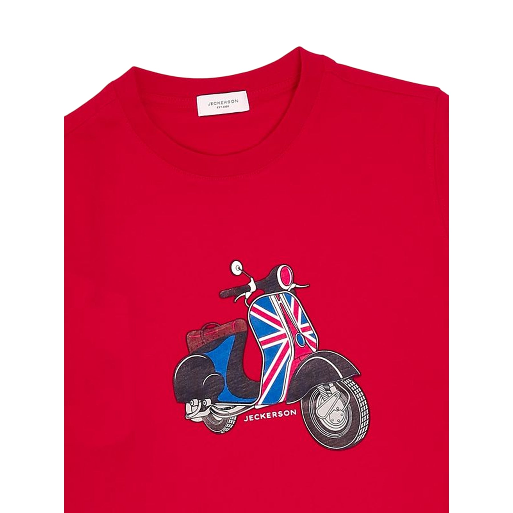 Questa T-shirt rossa da bambino di Jeckerson unisce comfort e stile con il suo taglio dritto e le maniche corte, perfette per ogni occasione. Il girocollo garantisce una vestibilità comoda, mentre la chiusura con due bottoni laterali facilita la vestizione. La stampa della Vespa sul davanti aggiunge un tocco di allegria e originalità, rendendo questa maglietta un capo unico e divertente per i più piccoli.
