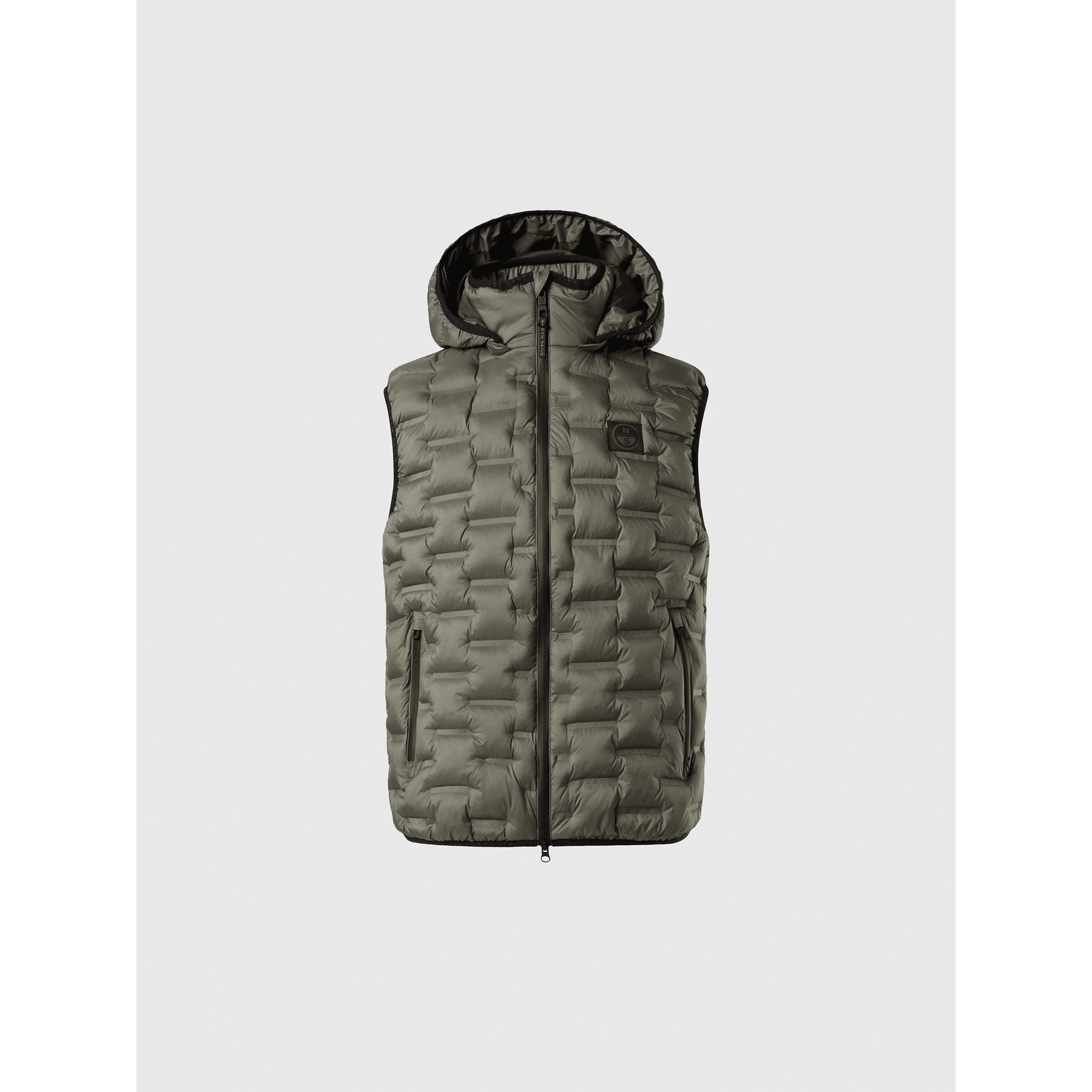 Un gilet ultra leggero che offre massimo comfort durante la mezza stagione. Il modello è realizzato in tessuto tecnico impermeabile con un'imbottitura sintetica riciclata che dimostra il nostro impegno per il consumo consapevole. Si caratterizza per l'innovativa trapuntatura senza cuciture, il cappuccio staccabile e la tasca interna per il cellulare. Caratteristiche Realizzato in tessuto impermeabile Vestibilità regolare Collo alto con cappuccio Chiusura con zip impermeabile a doppio cursore Tasche con zip impermeabile Tasca interna con zip Dettagli in lycra Fodera riciclata Design termosaldato senza cuciture Imbottitura sintetica riciclata Patch North Tech sul petto