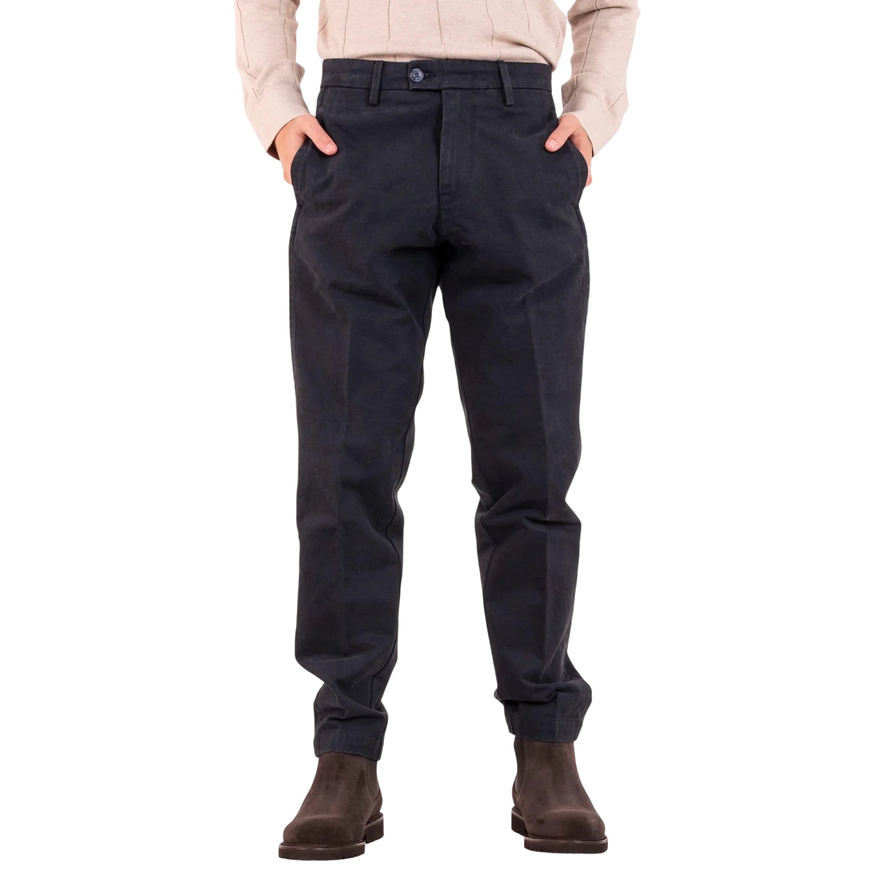 Pantalone in cotone di qualità superiore firmato Re Hash che unisce comfort e stile classico. Realizzato in un elegante blu navy, questo capo essenziale si distingue per i dettagli funzionali: chiusura affidabile con zip, bottone e gancio in metallo che garantisce una vestibilità sicura durante la giornata. Le tasche laterali verticali offrono praticità per riporre gli oggetti personali, mentre le tasche posteriori a filo con bottone mantengono un profilo pulito e raffinato. Perfetto per chi ricerca un pantalone versatile, durevole e dal design senza tempo che si adatta a molteplici occasioni.