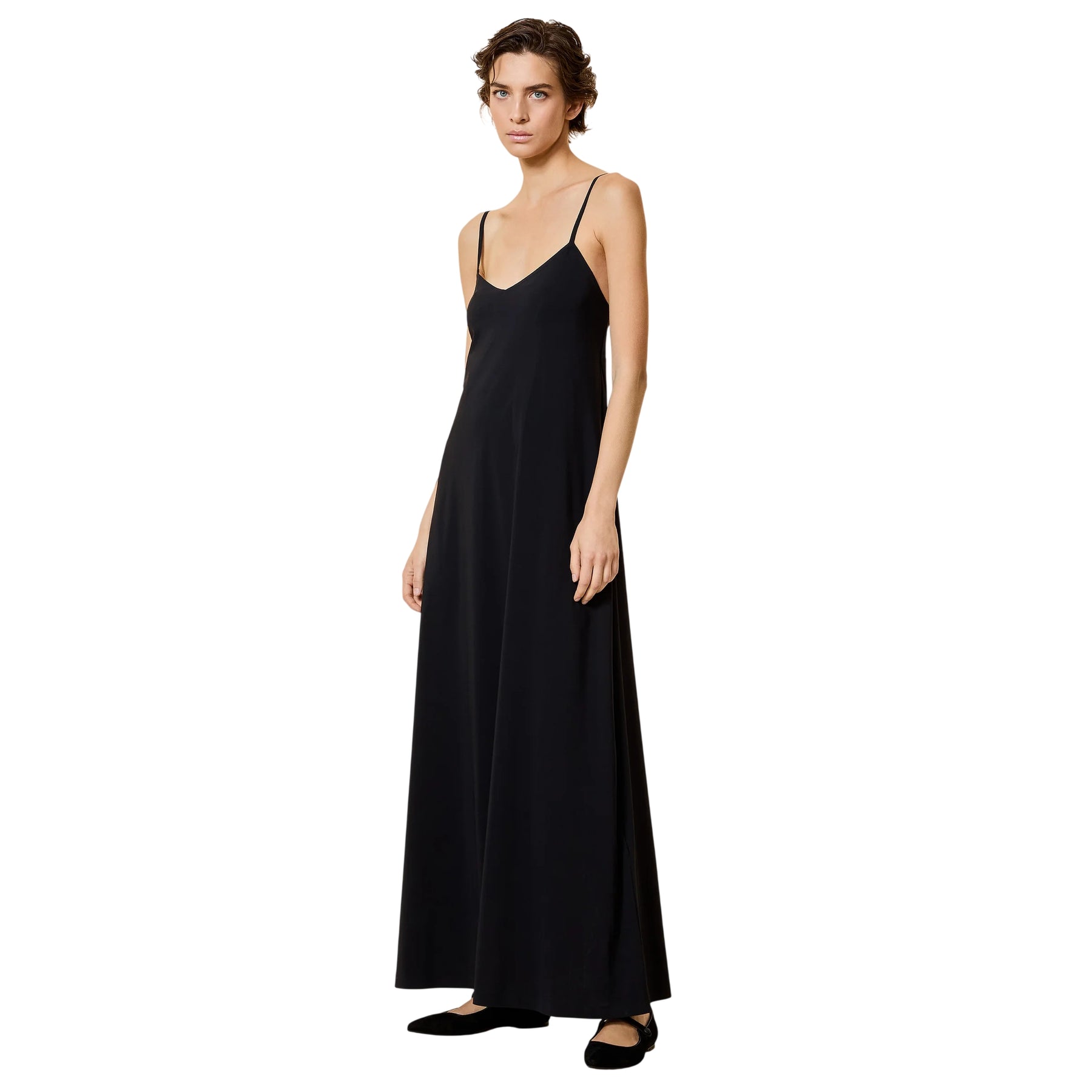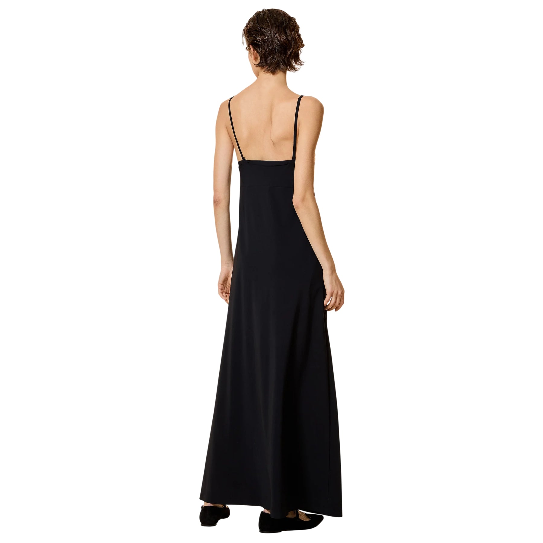 Eleganza essenziale e linee pulite definiscono questo Abito donna lungo nero di RRD, pensato per valorizzare la silhouette con semplicità e raffinatezza. Realizzato in tessuto Surflex elasticizzato, offre una vestibilità fluida e confortevole che accompagna i movimenti con naturalezza. La lunghezza alle caviglie slancia la figura, mentre lo scollo a V e le spalline sottili aggiungono un tocco femminile e delicato. Completano il design le tasche invisibili, pratiche e discrete, per un capo versatile perfetto sia di giorno che di sera.