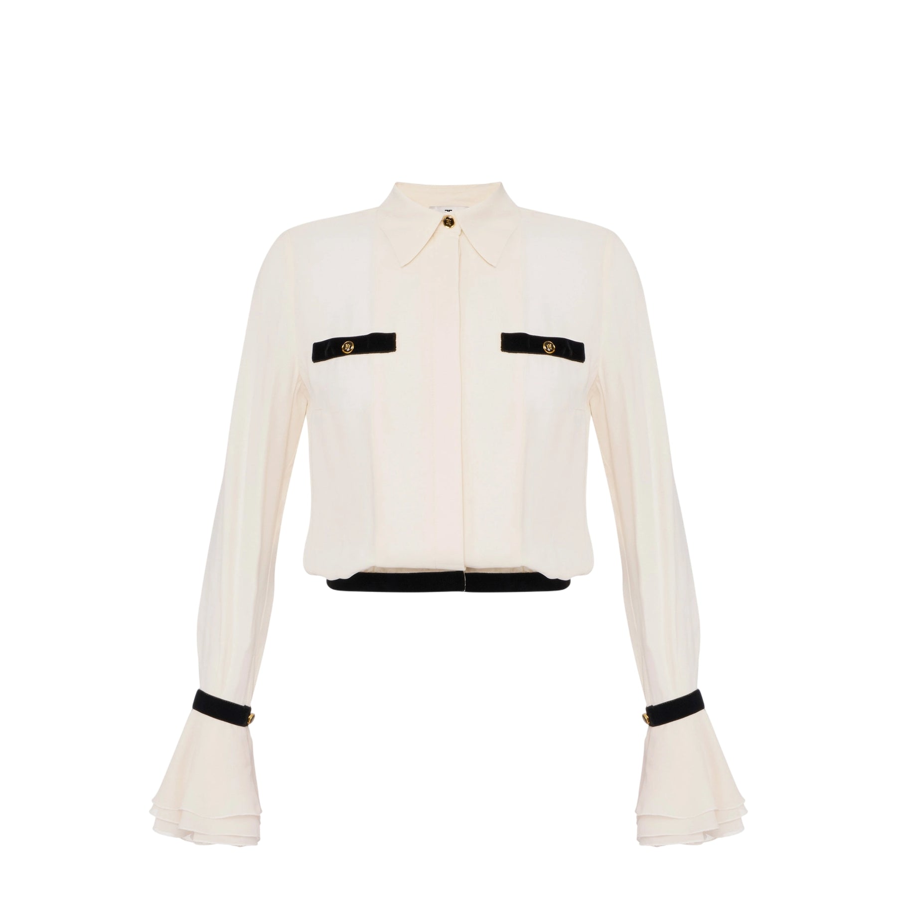 Questa Camicia donna in georgette firmata Elisabetta Franchi presenta una vestibilità slim che valorizza la silhouette, con un colletto classico e un plastron frontale che garantisce struttura ed eleganza. I tripli polsi a campanella conferiscono un tocco di leggerezza e movimento, mentre i bottoni smaltati con logo aggiungono un dettaglio raffinato e distintivo. Perfetta per chi cerca un capo sofisticato e femminile da indossare in ogni occasione.