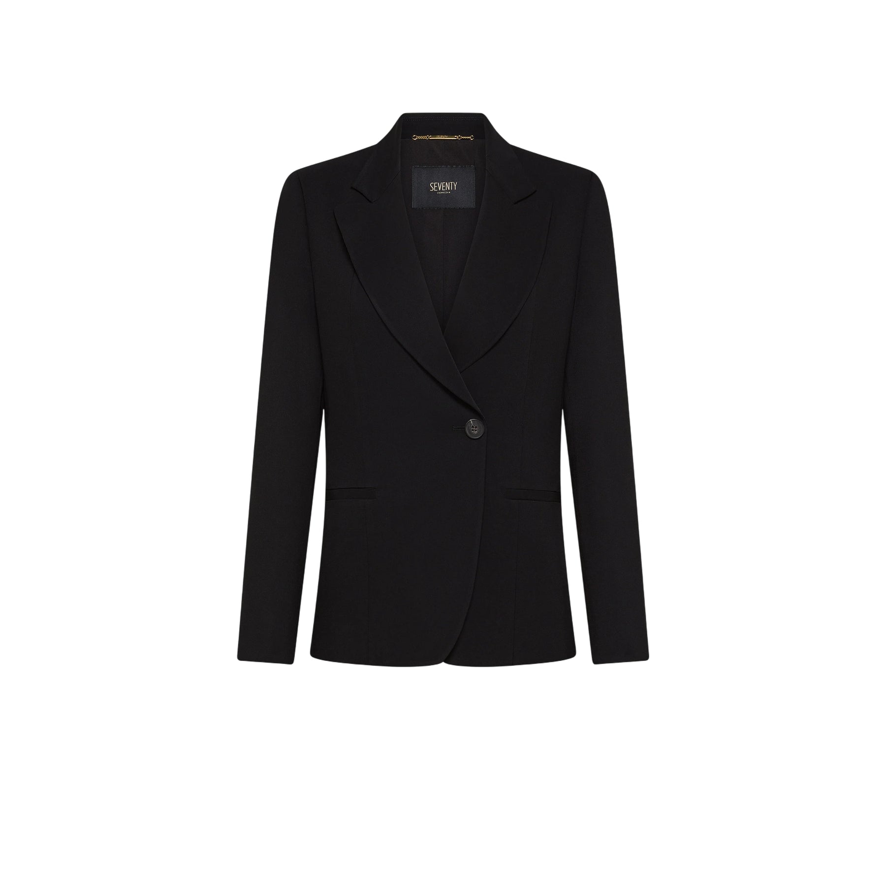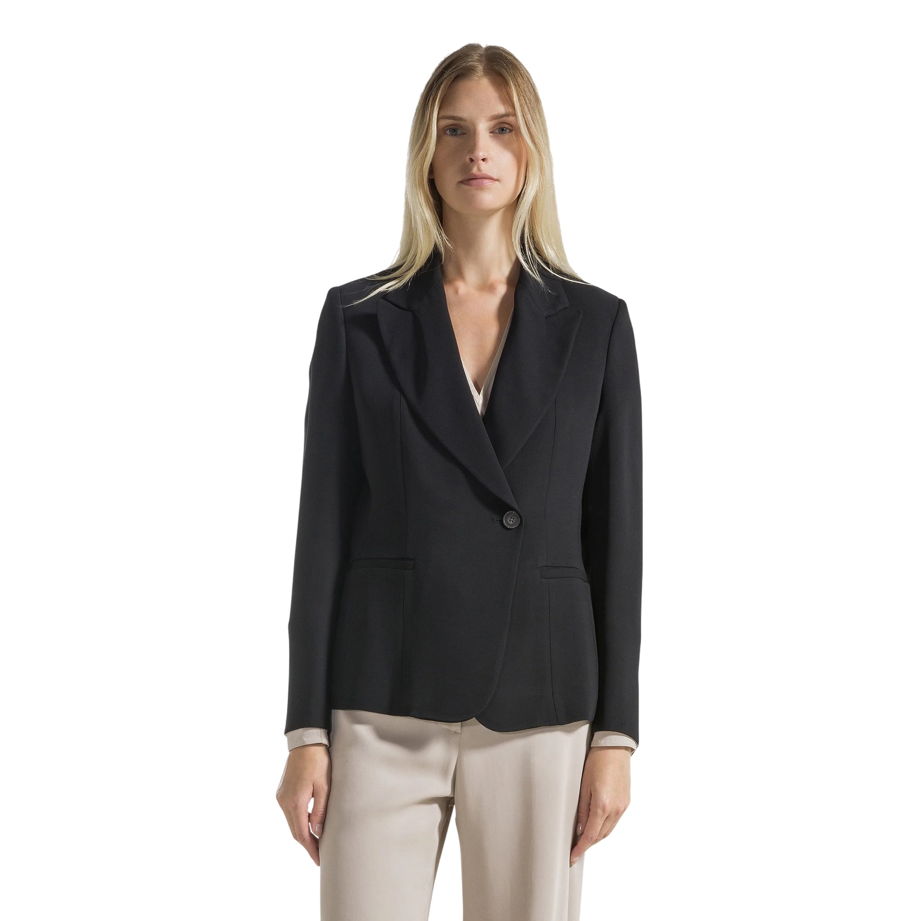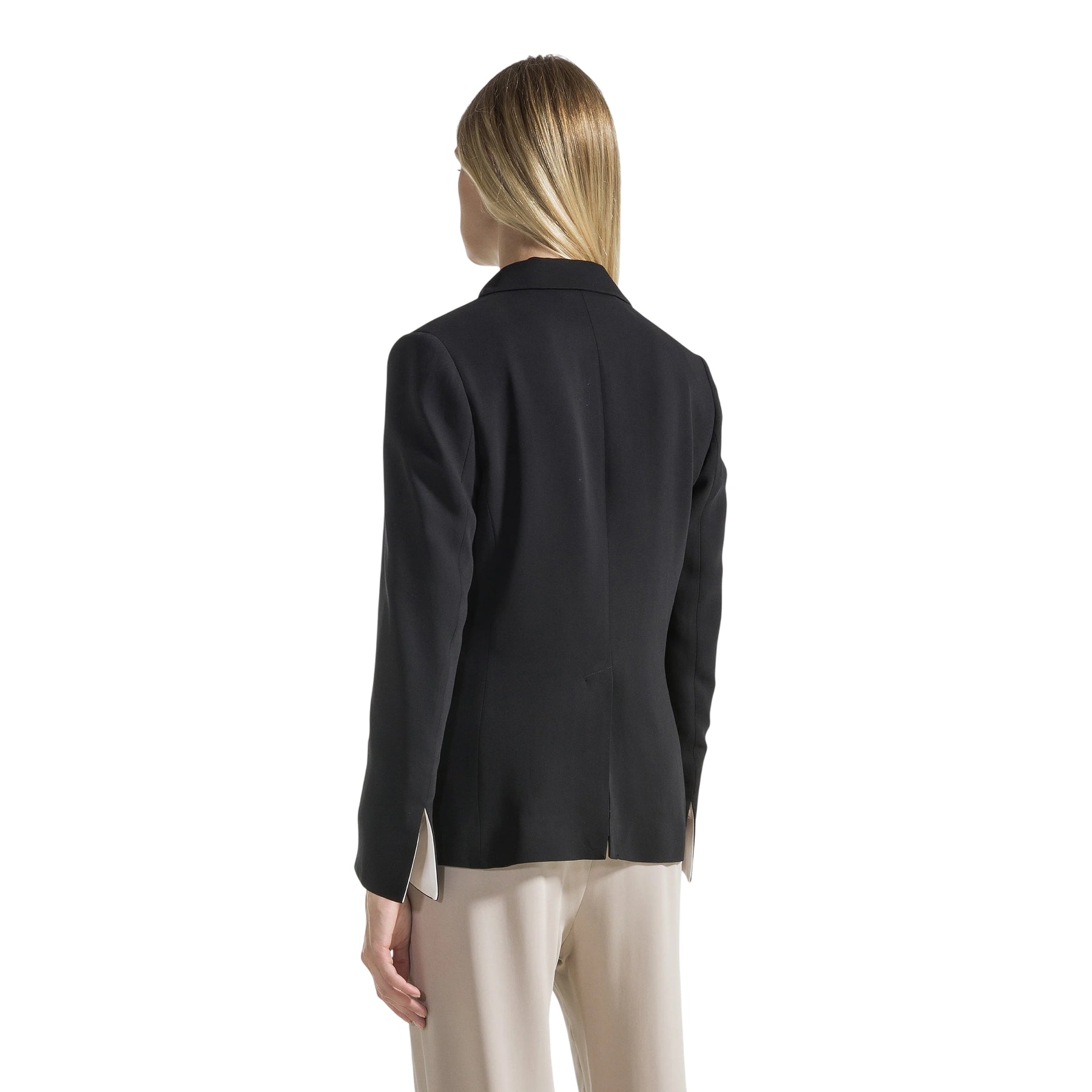 Elegante giacca smoking monopetto realizzata in pregiato cady, caratterizzata da un sofisticato risvolto al fondo manica in bianco che cattura lo sguardo. Lo spacchetto laterale garantisce libertà di movimento e una silhouette impeccabile. Un capo versatile che trasforma ogni occasione speciale in un momento di pura raffinatezza.