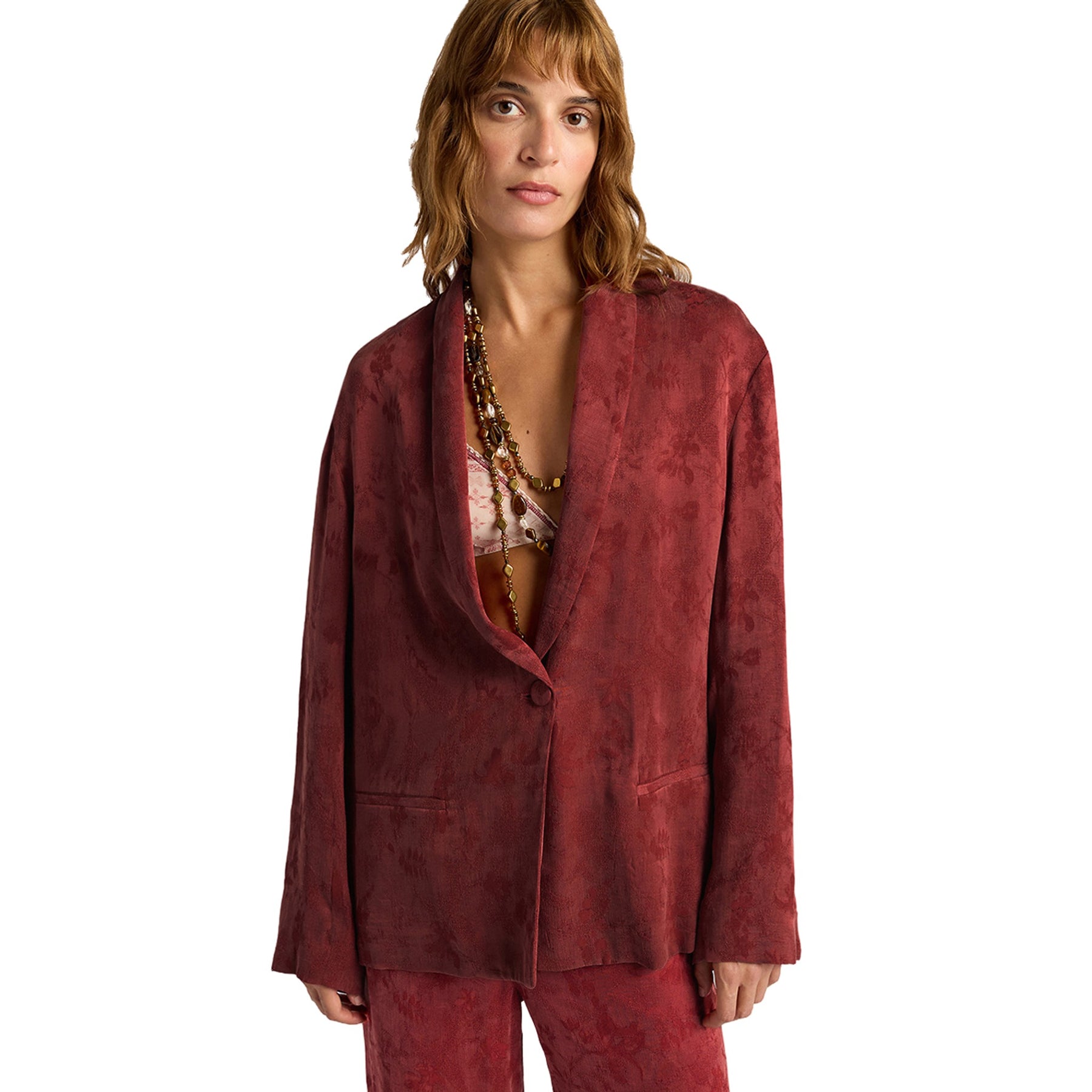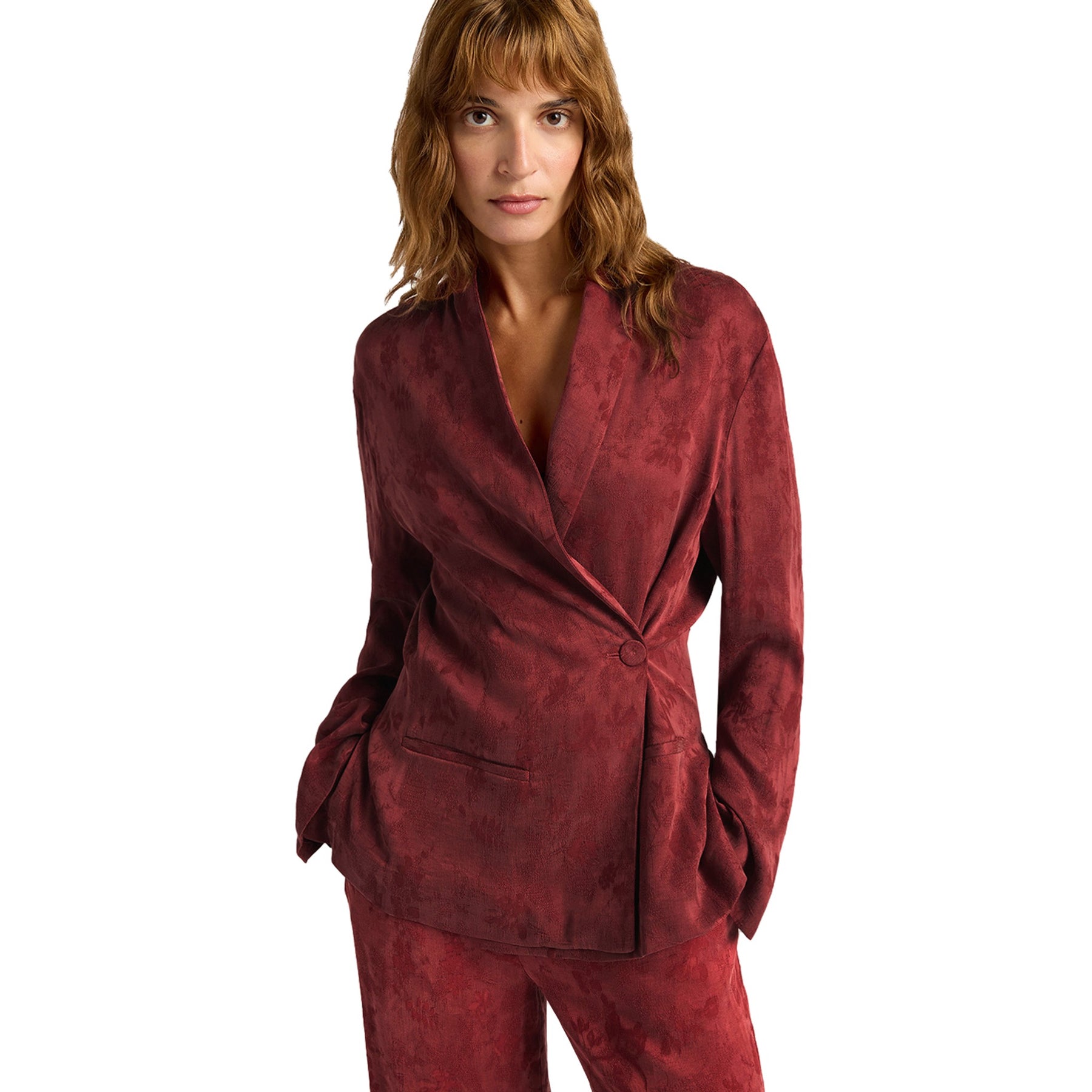 Scopri la Giacca da donna dal design comodo e decostruito firmata Momonì. La sua chiusura con bottone laterale decentrato le conferisce un aspetto originale. Ma ciò che la rende unica è la decorazione jacquard floreale su base bordeaux che dona un senso di raffinatezza e femminilità.