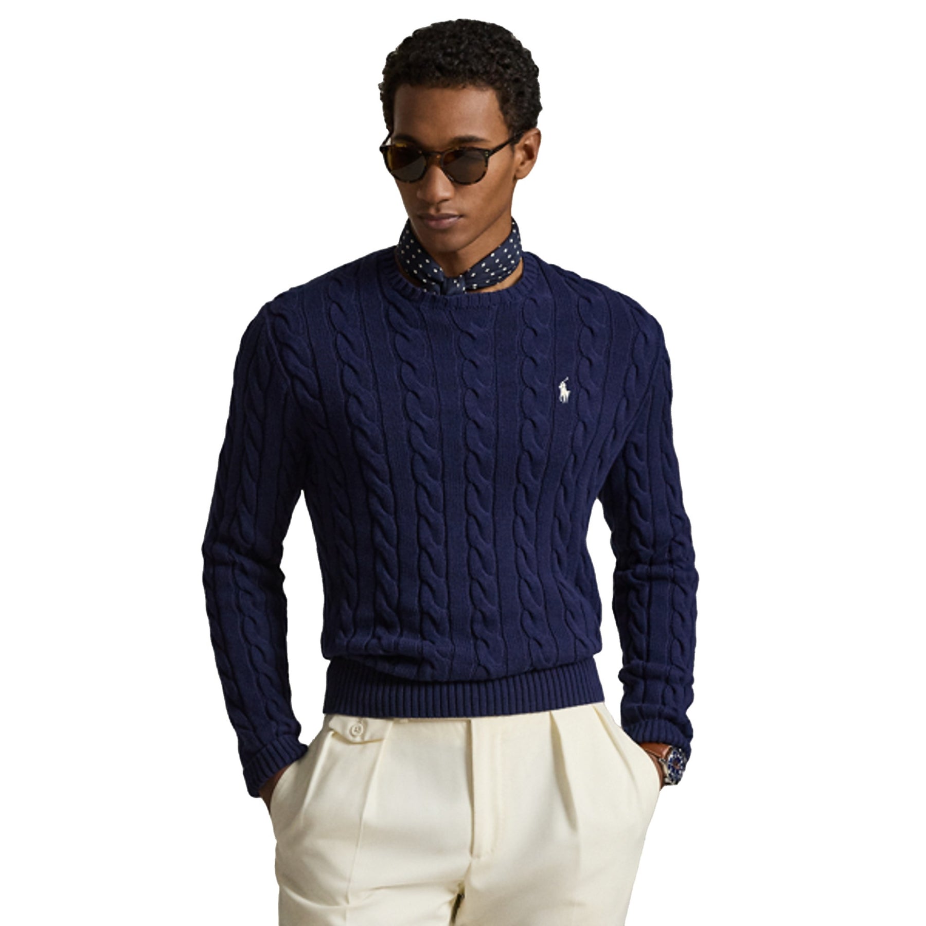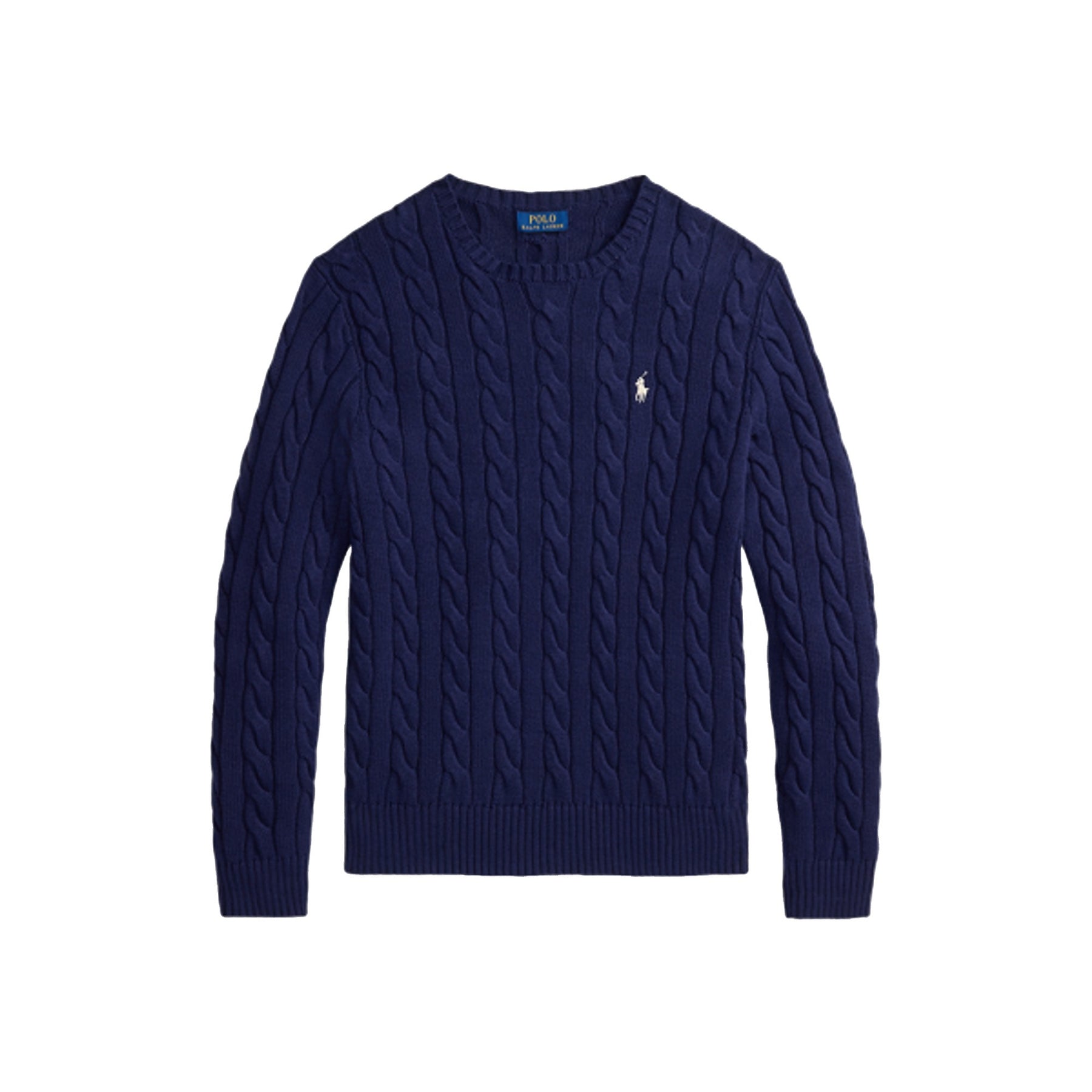 Maglia da uomo in cotone con lavorazione a trecce, nella variante color blu, dal gusto classico e intramontabile, firmata Polo Ralph Lauren. Il modello presenta girocollo e maniche lunghe, con scollo, polsi e orlo rifiniti a coste per una vestibilità confortevole e ben definita. La lavorazione a trecce all over arricchisce la tinta unita, conferendo texture ed eleganza al capo. Il pony ricamato sul petto completa il design con l’iconico dettaglio del brand.