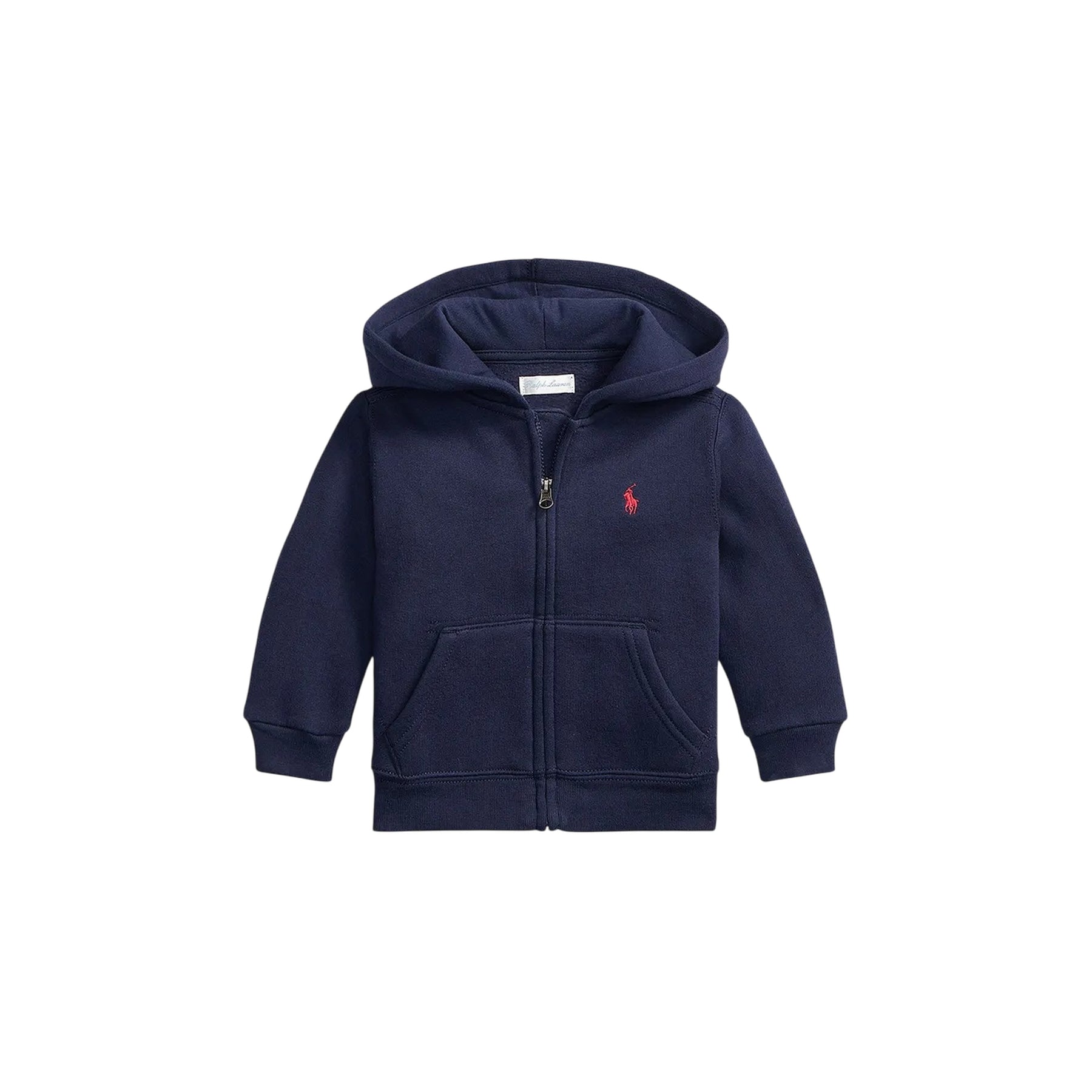 Questa Felpa Neonato Navy firmata Ralph Lauren è perfetta per una giornata all'aria aperta! Con il cappuccio foderato in jersey e la chiusura con zip, il tuo piccolo rimarrà al caldo e protetto dalle intemperie. Le maniche lunghe con polsini a coste e le tasche a marsupio separate lo rendono comodo e funzionale.