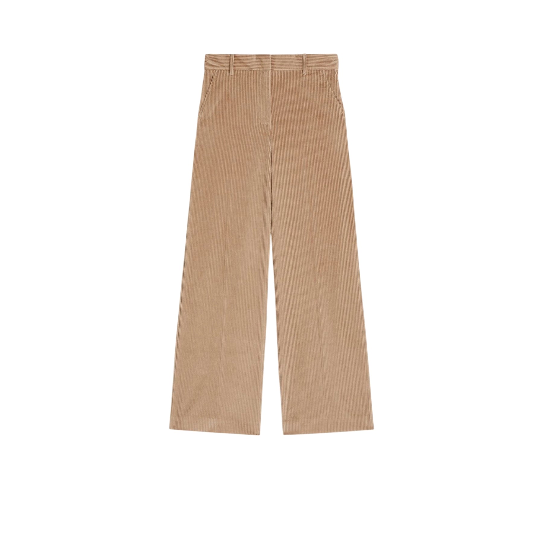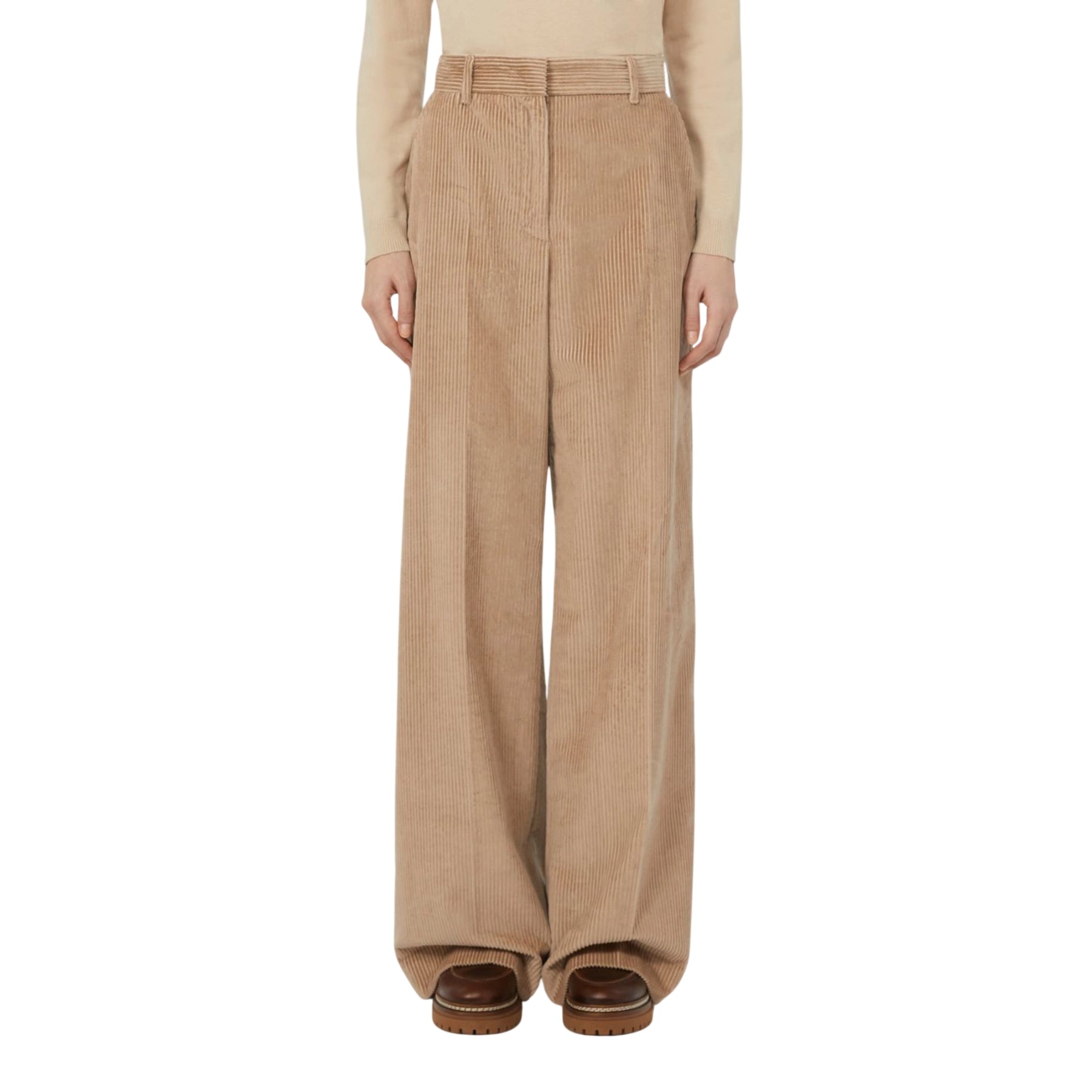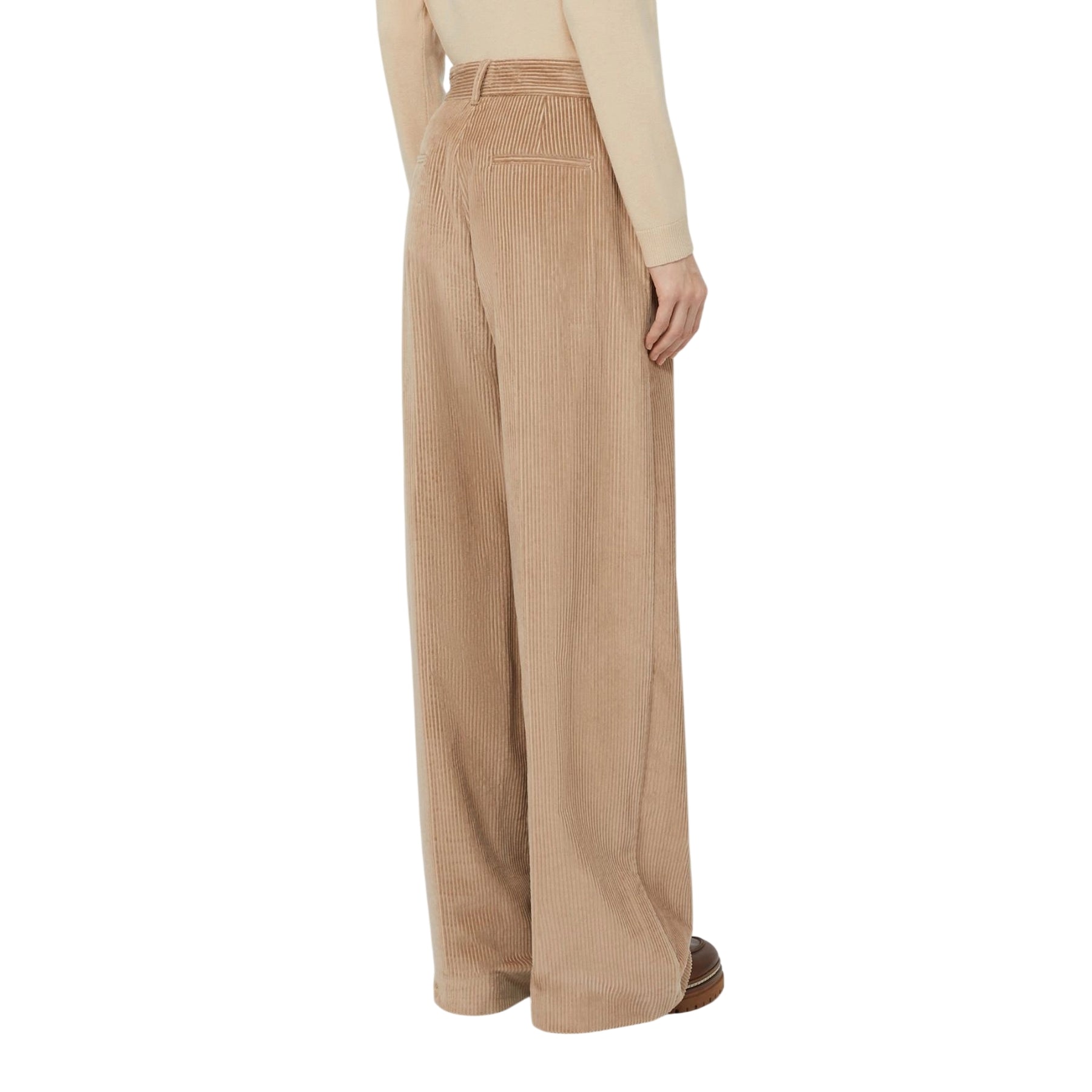 Pantaloni donna dal taglio ampio e affascinante firmati Max Mara Weekend, realizzati in morbido velluto a coste beige. La silhouette a gamba larga regala movimento e eleganza senza compromessi sul comfort. Chiusura pratica con ampia linguetta in vita, zip e gancio di sicurezza per una vestibilità perfetta. Tasche laterali funzionali e tasche a filetto sul retro completano il design. Un capo versatile che si adatta a ogni occasione, dal casual al più raffinato.