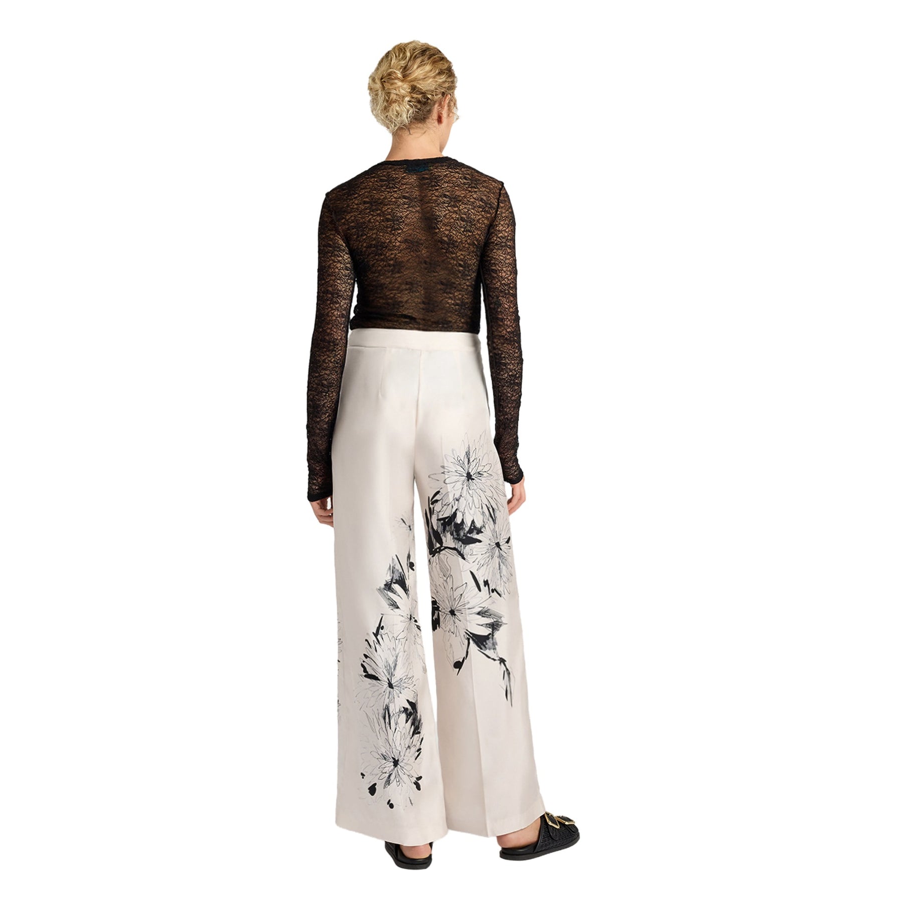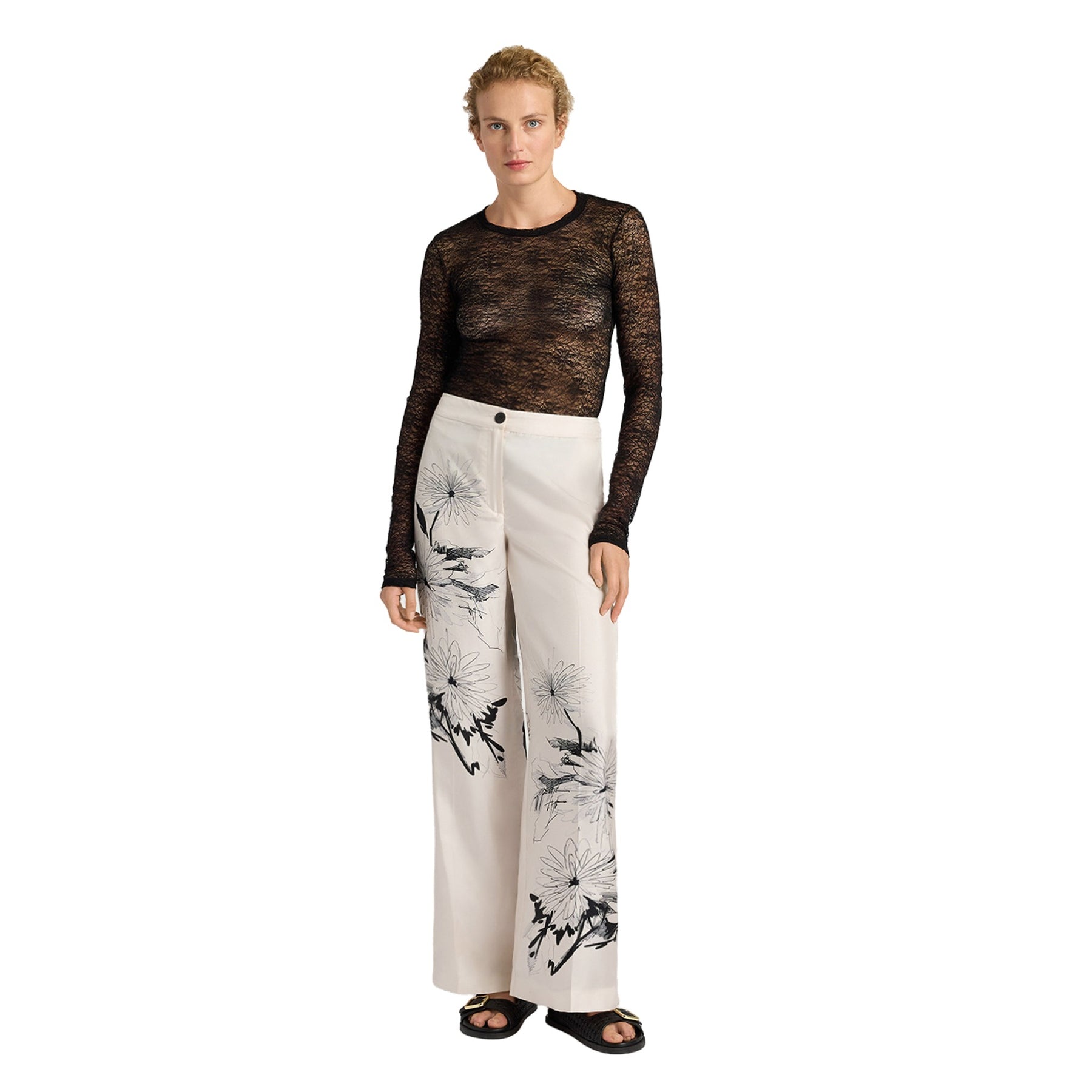 Stampa fiori nera su sfondo bianco.