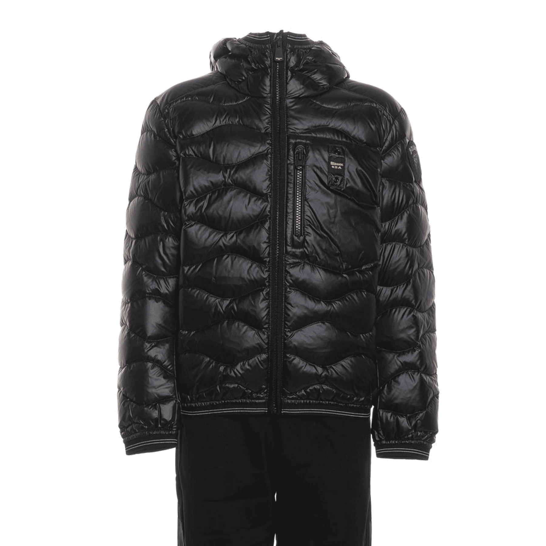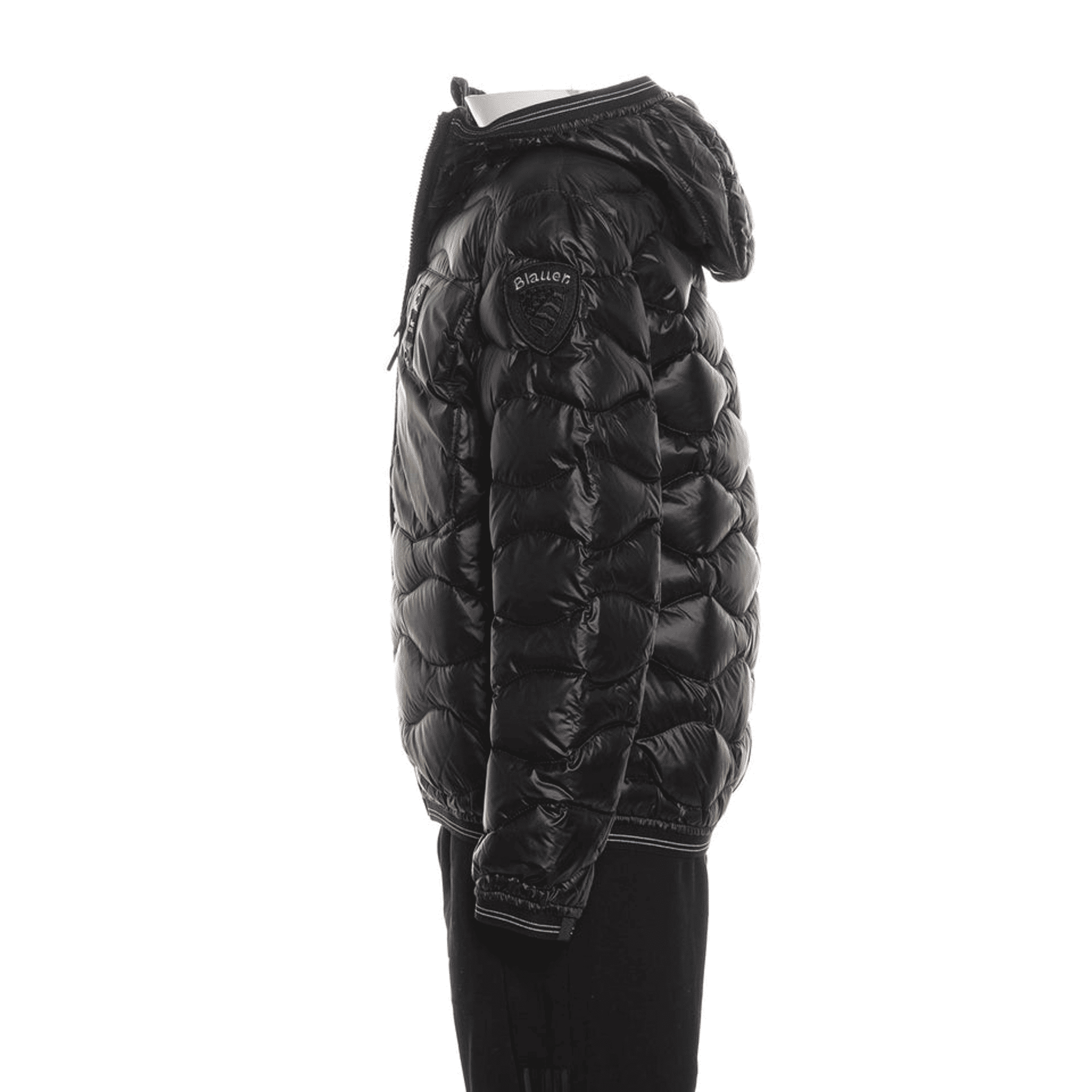 Piumino Blauer Brinton Jr da bambino in tessuto di poliammide trapuntato a onde, corto, con imbottitura in piuma, fodera a contrasto, bordo cappuccio fisso polsini e fondo in tape elastico rigato tono su tono, chiusura centrale e tasche a filo con zip a scomparsa, logo scudetto applicato sulla manica, taschino verticale sul petto con passante logato e chiusura zip Imbottitura: 90% Piumino 10% Piuma