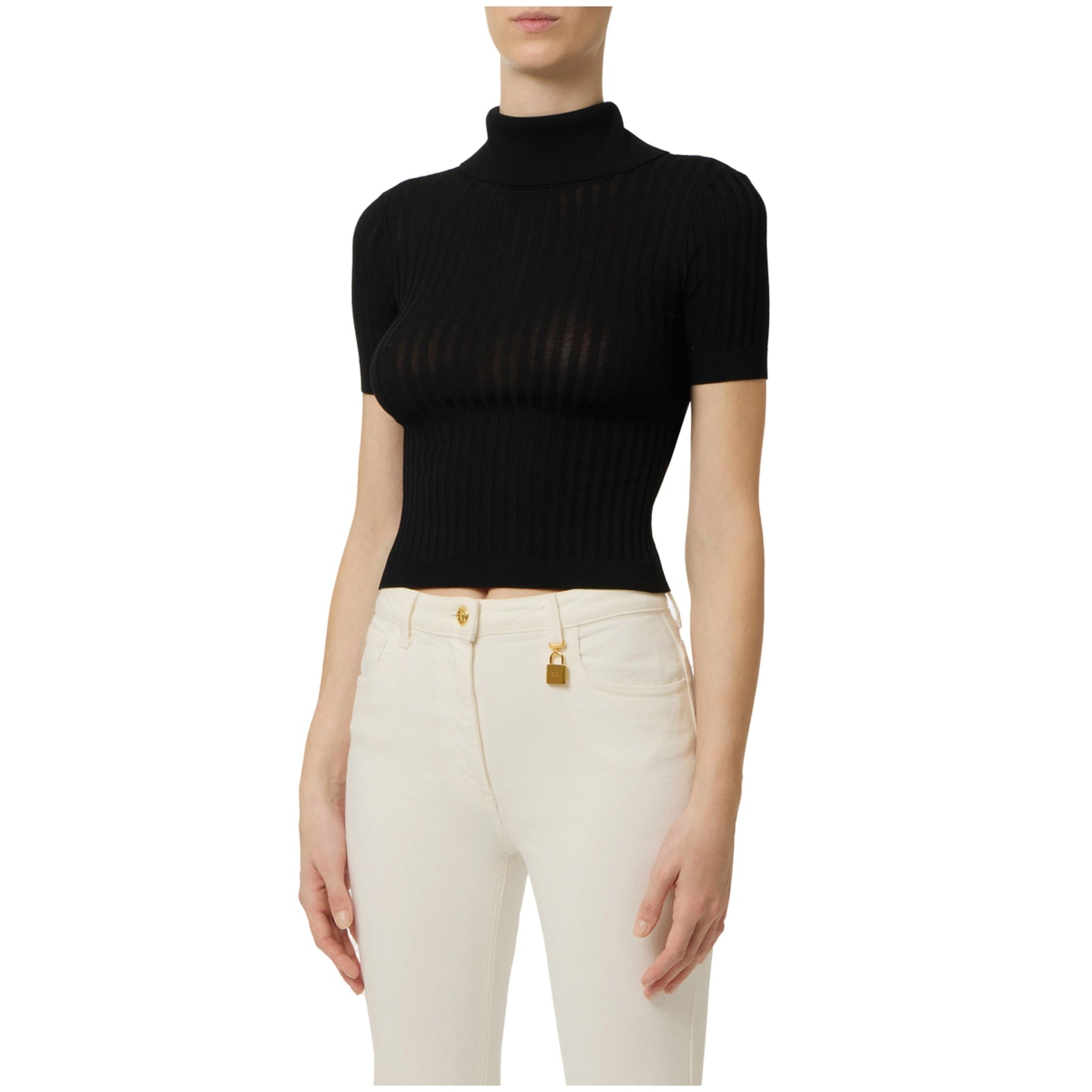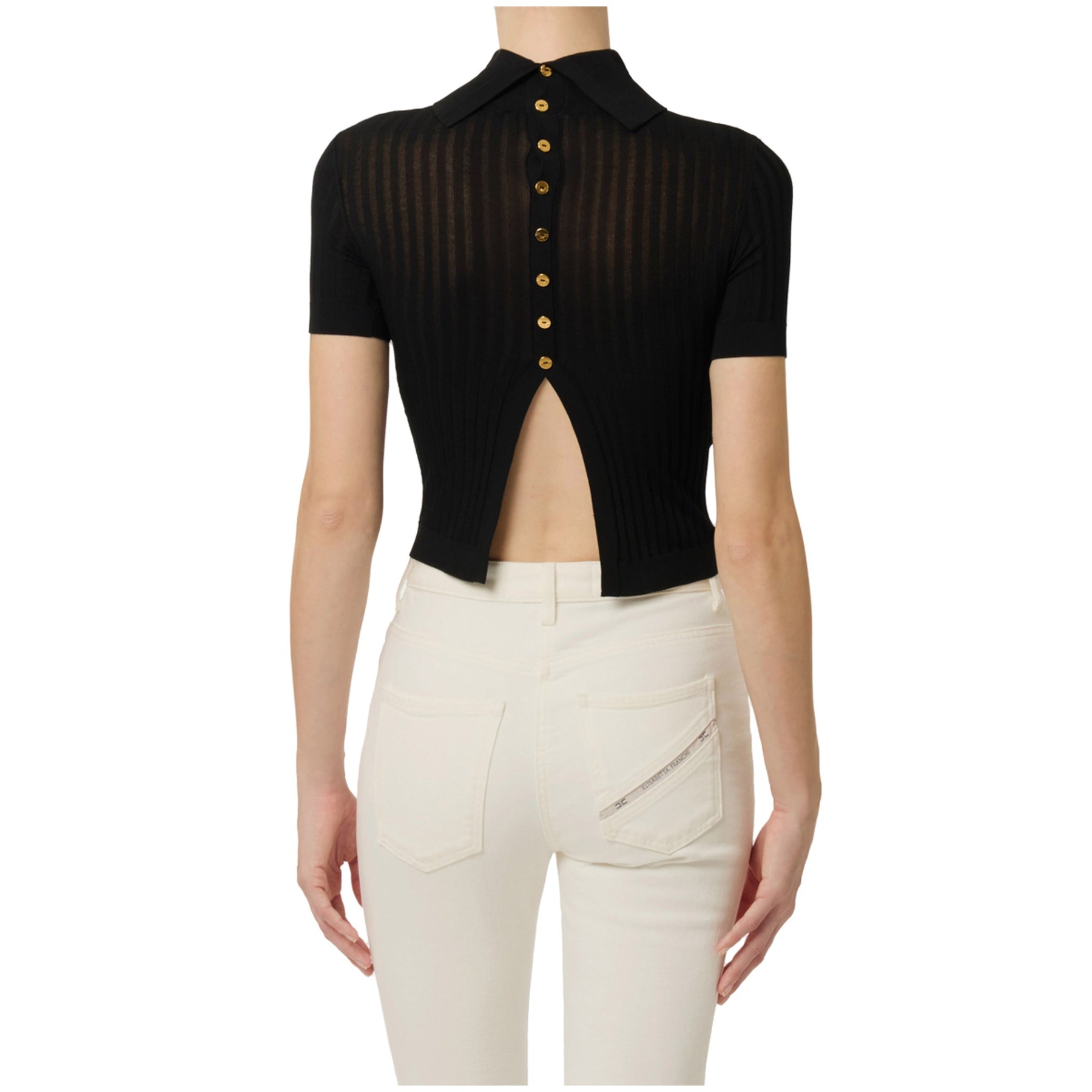 Elegante Top donna in maglia raffinata con dettagli che catturano lo sguardo firmato Elisabetta Franchi. Il collo dolcevita avvolge con comfort, mentre le maniche corte garantiscono libertà di movimento. La lavorazione in maglia presenta trasparenze strategiche che aggiungono sensualità e movimento al capo. Sul retro, un'apertura esclusiva con bottoni in metallo dorato conferisce un tocco di sofisticazione e permette una vestibilità personalizzata. Perfetto per chi ricerca un pezzo versatile che unisce stile contemporaneo e dettagli ricercati.