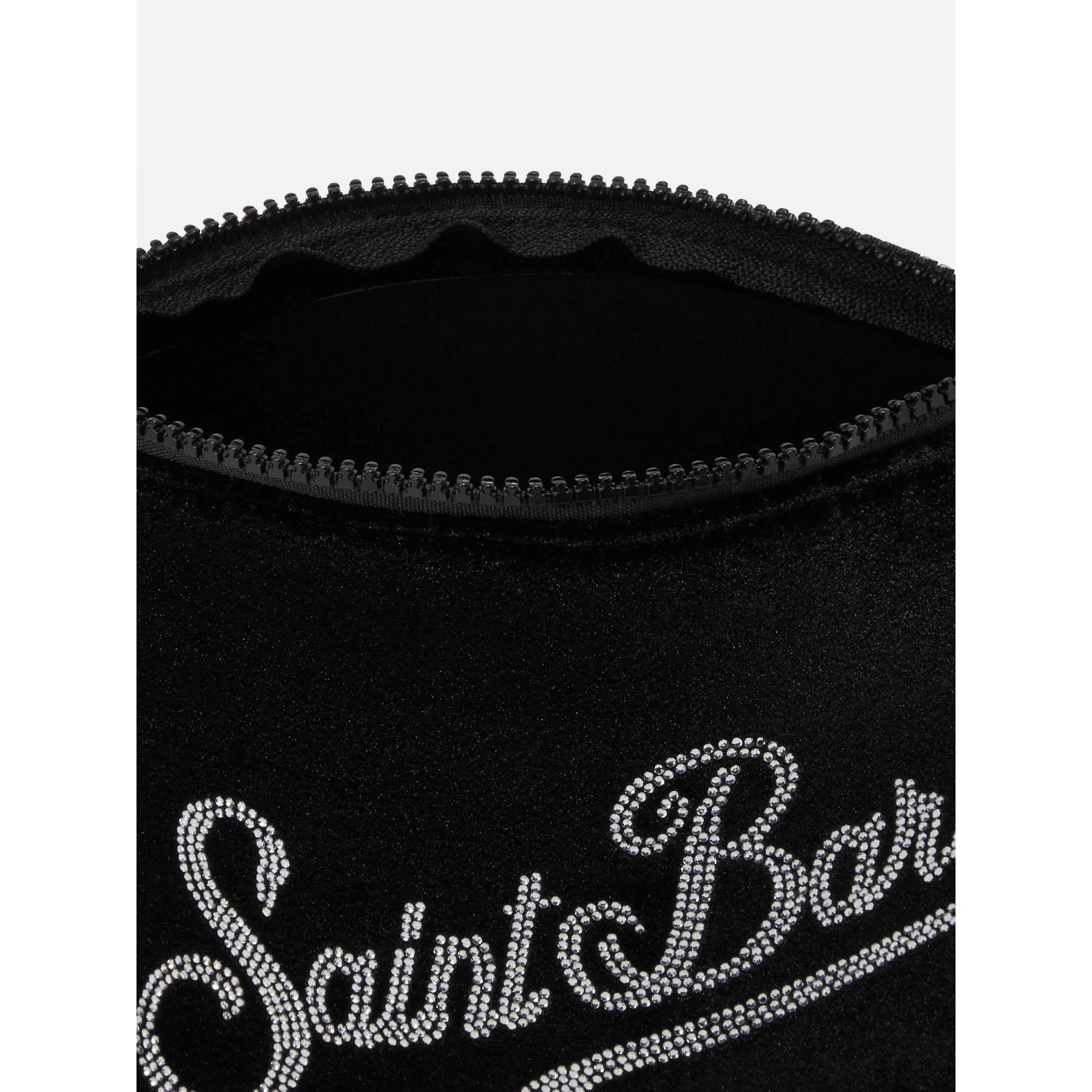 Iconica e chic: velluto nero e strass per la sera. Pochette in tessuto scuba e velluto Tinta unita nero Logo in strass Passante per polso in gros-grain Logo strass Dimensioni: 21 x 15,5 x 7 cm