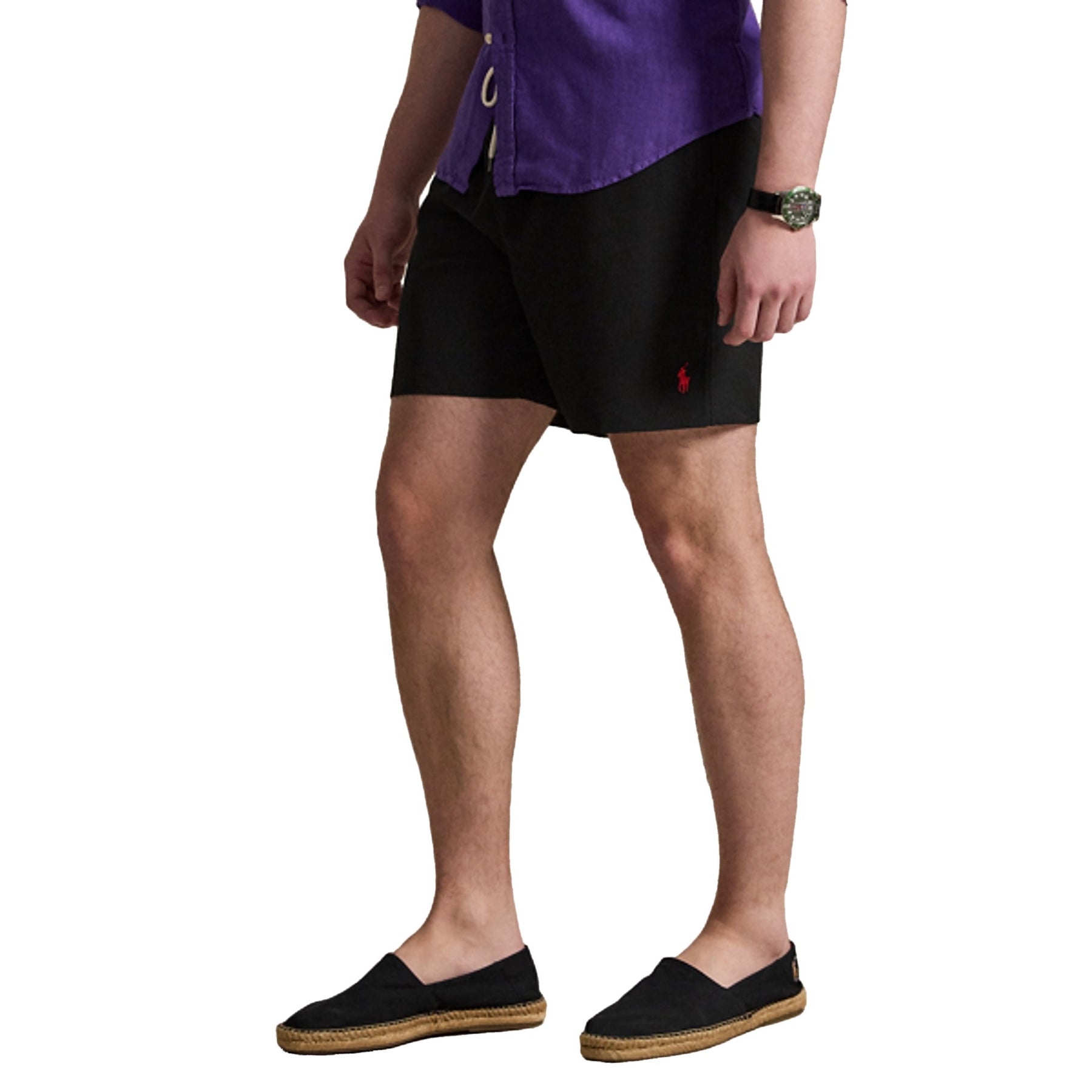 Boxer da mare da uomo Traveler color nero, dallo stile essenziale e intramontabile, firmati Polo Ralph Lauren. La vestibilità classic fit con vita naturale e taglio comodo sulle gambe garantisce comfort e libertà di movimento. La fascia in vita elasticizzata con coulisse permette una regolazione pratica, mentre le tasche laterali all’americana e la tasca posteriore con bottone ed etichetta logata assicurano funzionalità. Il modello è completato dallo slip interno in rete e dal pony ricamato sulla gamba, dettaglio iconico del brand.